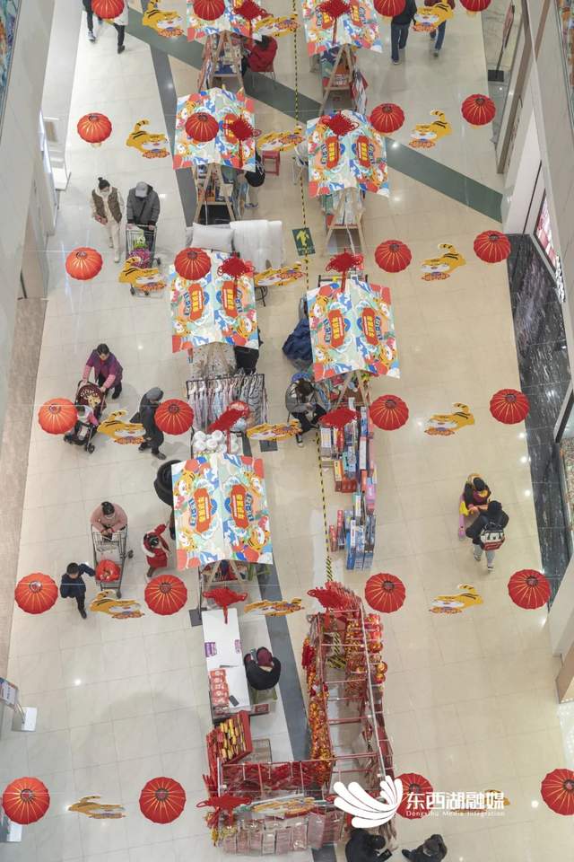 金银潭永旺店,多名“遛娃”家长从年货集市中穿过(记者 晏君 摄 )