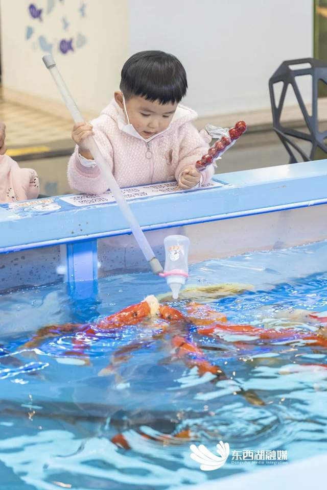 海林广场负一楼处,小朋友一手拿着糖葫芦一手喂着鱼(记者 晏君 摄 )