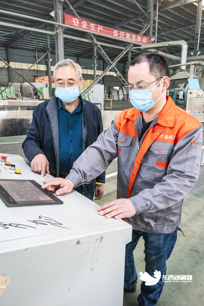 刘彦方(左)在自主研发的全自动打包机前指导操作