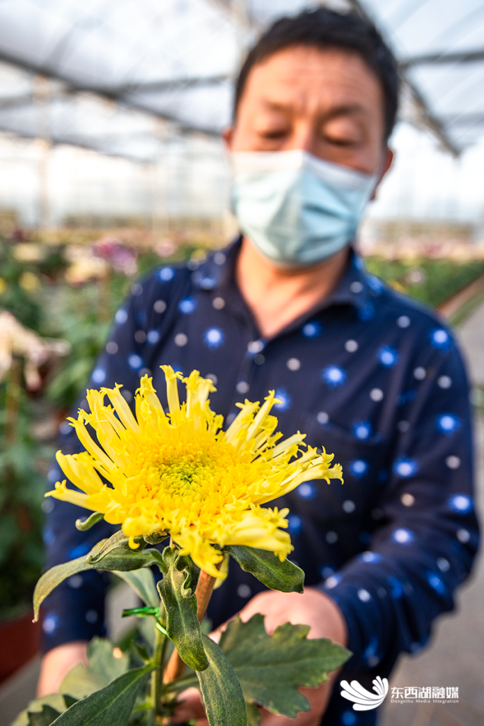 他端起一盆名为盘龙金爪的黄色菊花介绍说,本土研发的汉派“盘龙系列”花色最多,其中的盘龙木兰花期长达45天。