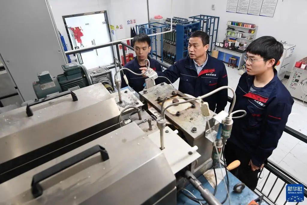 福建闽江学院服装与艺术工程学院教授李永贵(中)在“福建省新型功能性纺织纤维及材料重点实验室”教学生做纺丝实验(2021年3月22日摄)。新华社记者 林善传 摄
