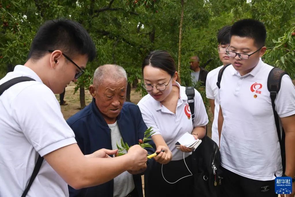 中国海洋大学红旗智援博士团成员在山东省乐陵市朱集镇大常村枣林向果农了解果树种植情况(2019年9月19日摄)。新华社记者 李紫恒 摄