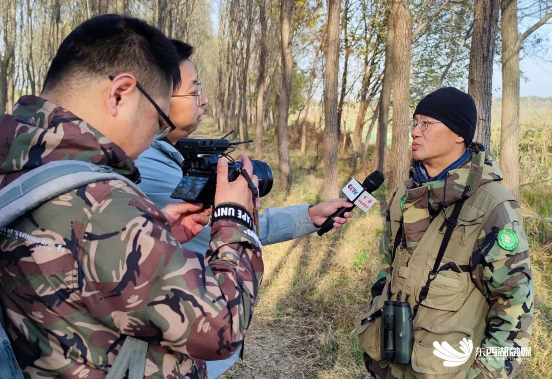 颜军(右)在天鹅湖畔接受央视采访