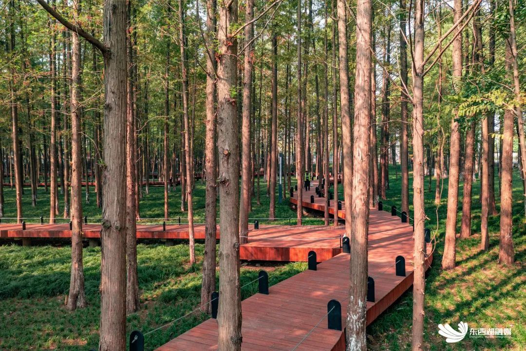 林下栈道曲折回环,滨水区设置沿湖步道,观湖平台及休憩场地,形成可观、可赏、可驻的滨水景观空间。绕湖散步,只见绚烂色彩与粼粼波光交相辉映,仿佛闯入森林秘境。