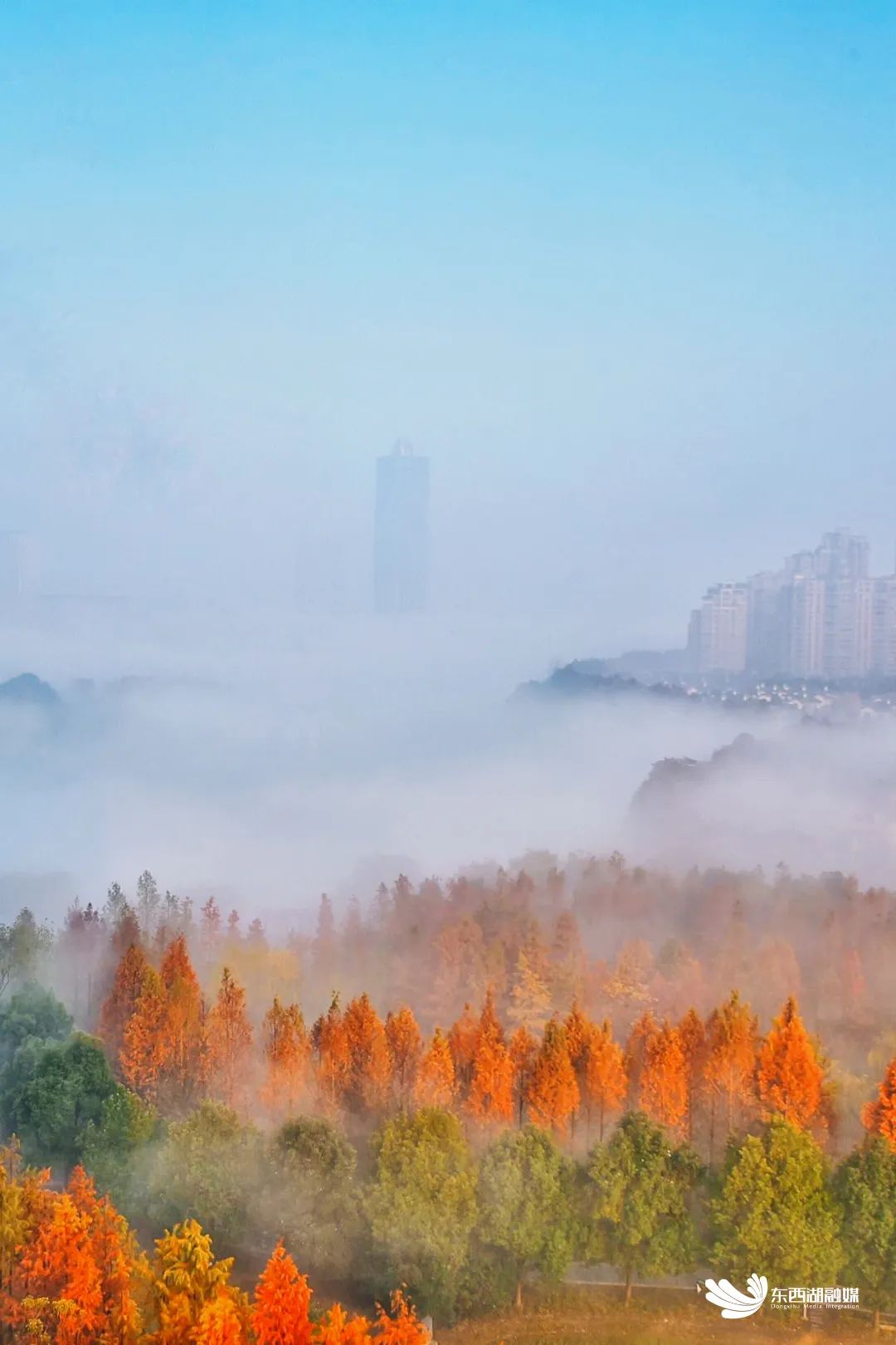 在霜寒露冷时,举起火把金银湖的水杉最先照亮城市的秋天。