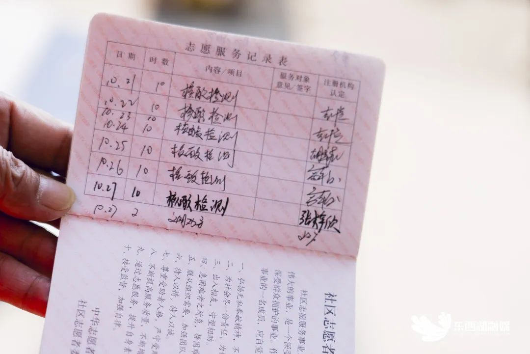 黄明山向记者展示了他的志愿服务记录本,从2020年到2022年,他参与的志愿服务工作记满了一本又一本,除了负责维护核酸检测点的现场秩序外,还包括文明劝导、清洁家园卫生等。