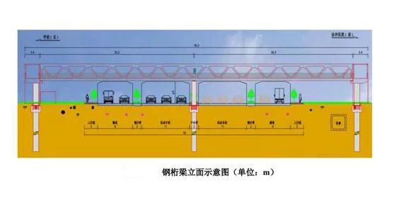 主梁采用两跨平行弦钢桁架结构,桁高3.8米,主桥下部结构采用圆形柱式墩桩基础。