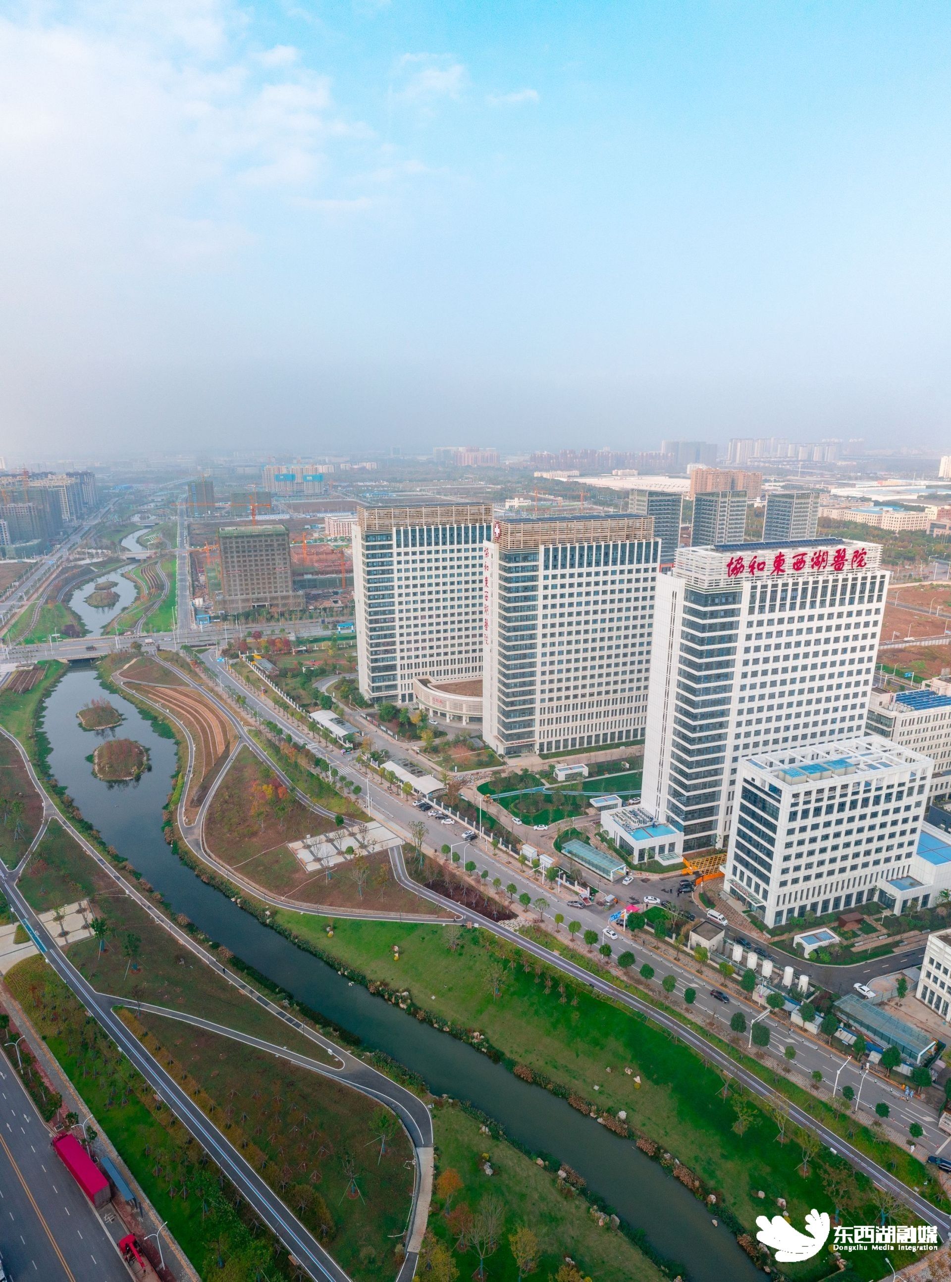 东西湖区人民医院(协和东西湖医院)位于东西湖区临空港大道与金北一路交汇处,占地面积170亩,建筑面积12.8万平方米,总投资达20亿元,设床位1200张,一期项目于2019年建成投用。其3栋20层的医院综合大楼并肩耸立,波浪状的4层裙楼与高层住院楼建筑连为一体,周围绿植环绕,宛如一艘航行在绿色海洋里的现代版“方舟”。