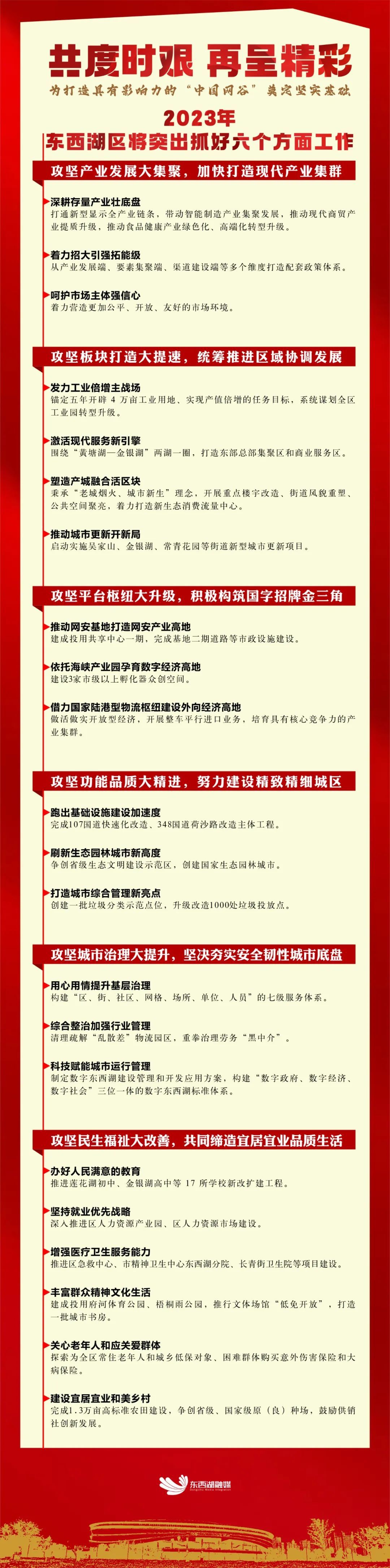 报告提出,2023年,将重点抓好六个方面工作:一是攻坚产业发展大集聚,加快打造现代产业集群,深耕存量产业壮底盘,着力招大引强拓能级,呵护市场主体强信心;二是攻坚板块打造大提速,统筹推进区域协调发展,发力工业倍增主战场,激活现代服务新引擎,塑造产城融合活区块,推动城市更新开新局;三是攻坚平台枢纽大升级,积极构筑国字招牌金三角,推动网安基地打造网安产业高地,依托海峡产业园孕育数字经济高地,借力国家陆港型物流枢纽建设外向经济高地;四是攻坚功能品质大精进,努力建设精致精细城区,跑出基础设施建设加速度,刷新生态园林城市新高度,打造城市综合管理新亮点;五是攻坚城市治理大提升,坚决夯实安全韧性城市底盘,持续优化疫情防控措施,用心用情提升基层治理,综合整治加强行业管理,科技赋能城市运行管理;六是攻坚民生福祉大改善,共同缔造宜居宜业品质生活,办好人民满意的教育,坚持就业优先战略,增强医疗卫生服务能力,丰富群众精神文化生活,关心老年人和应关爱群体,建设宜居宜业和美乡村。