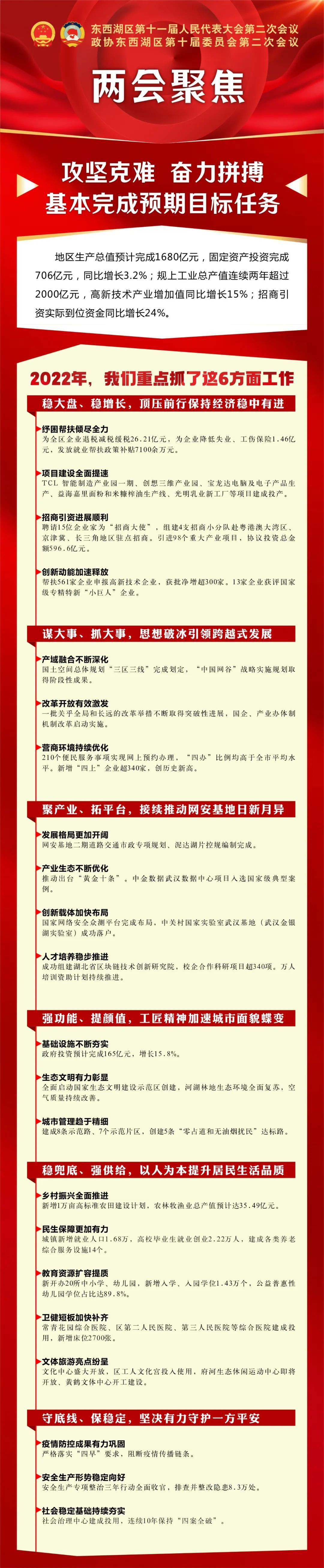 报告说,2022年,在市委、市政府和区委的坚强领导下,我们坚持以习近平新时代中国特色社会主义思想为引领,深入贯彻落实习近平总书记考察湖北武汉重要讲话精神,认真学习党的二十大精神,与全区人民一道,攻坚克难、奋力拼搏,基本完成预期目标任务。