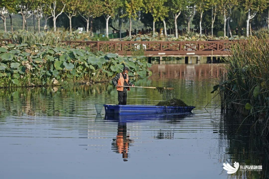 暮色四合时分,落日余晖在墨水湖面映射出粼粼波光,几名保洁人员划着船在湖中心打捞浮萍水草。