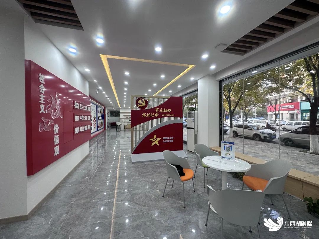 服务中心的红色招牌大气、醒目,一排大幅落地窗使室内空间开阔明亮,装修装饰以暖黄、鲜红两种色调为主,桌椅等家具造型时尚,整体色彩搭配养眼。