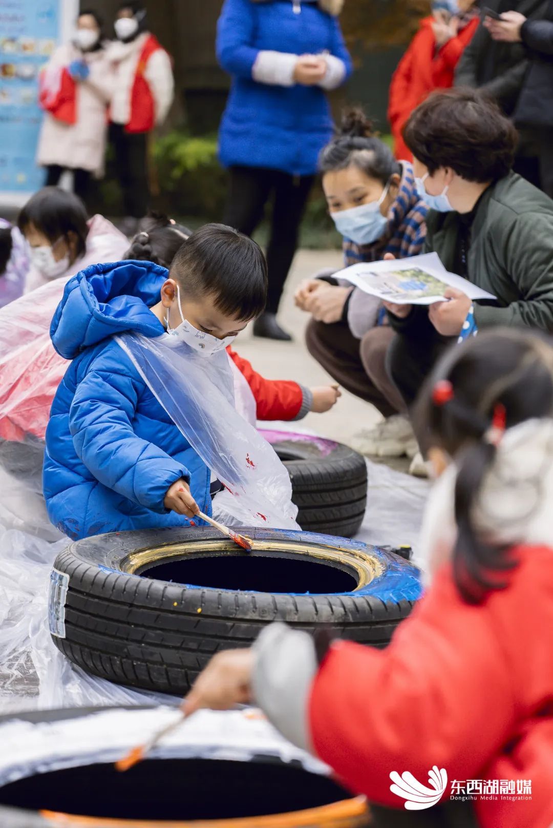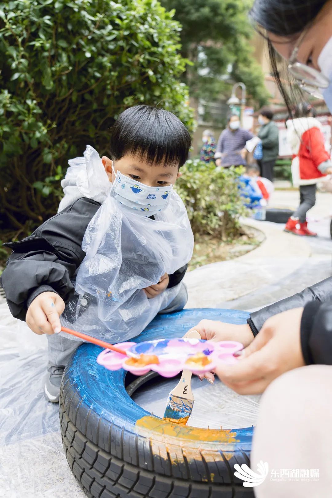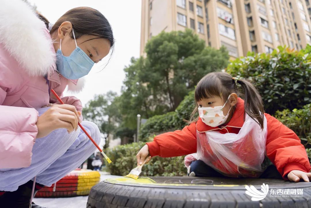 勾线、平涂、点彩……连日来,熙龙湾小区19组亲子家庭发挥想象力与创造力,利用闲暇时间套上手套、系好围裙、撸起袖子,给近百个轮胎“来点颜色瞧瞧”。