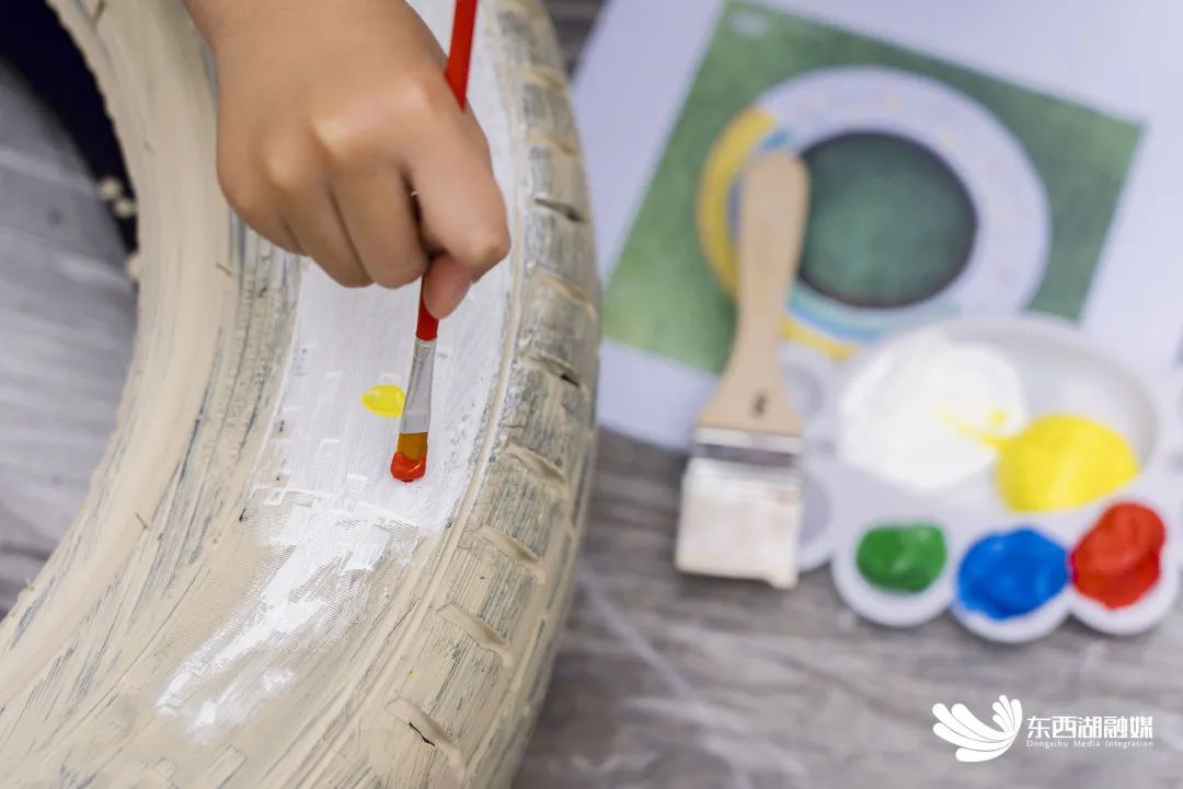 一手端调色盘,一手执画笔,为一个个黑乎乎的轮胎披上了颜色鲜艳“新衣”。“白雪公主”“海绵宝宝”“小猪佩奇”“甜甜圈”“向日葵”……很快,一个个主题鲜明、富有童趣的作品就产生了。