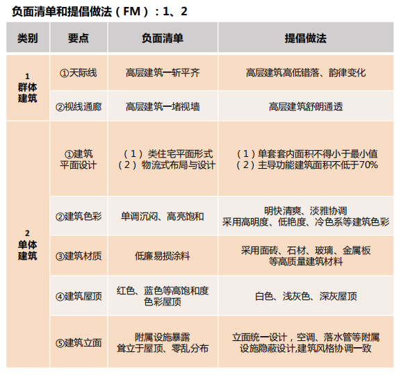 为保障“整体颜值”,围绕产业园区规划与建筑设计,文件提出2大方面7个负面清单。以群体建筑为例,即高层建筑禁止一斩平齐、高层建筑禁止一堵视墙,划好产业园区建设底线,保证区域品质水平。