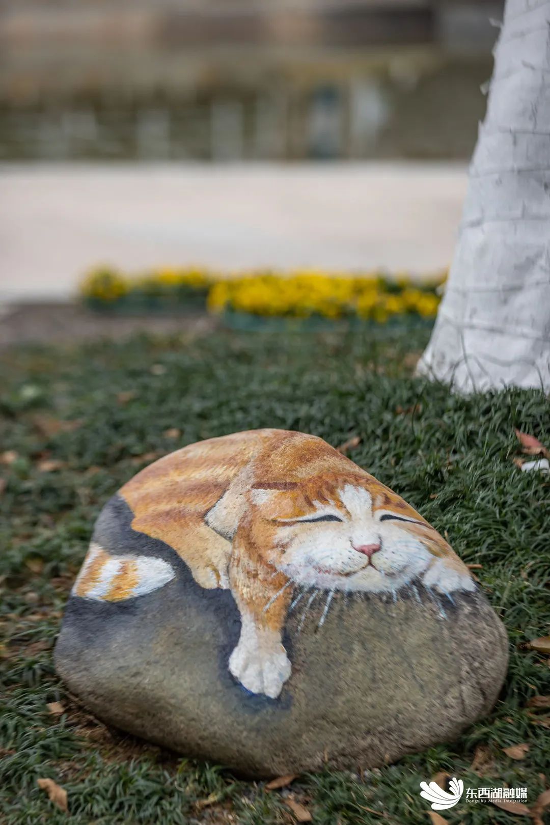 “除了二十四节气挂牌,我们还跟小区荷花苑的一位居民商量好,希望她能画24幅画,我们来装裱,然后挂到长廊里增加美感。”陈秀珍指着长廊一端的草坪,草坪里有一颗石头,被绘制成了白兔,放在草坪里栩栩如生,“这都是她画的,还有池塘边的鱼,榕树下的小猫和孔雀,她就是我们的社区空间绘画师。”