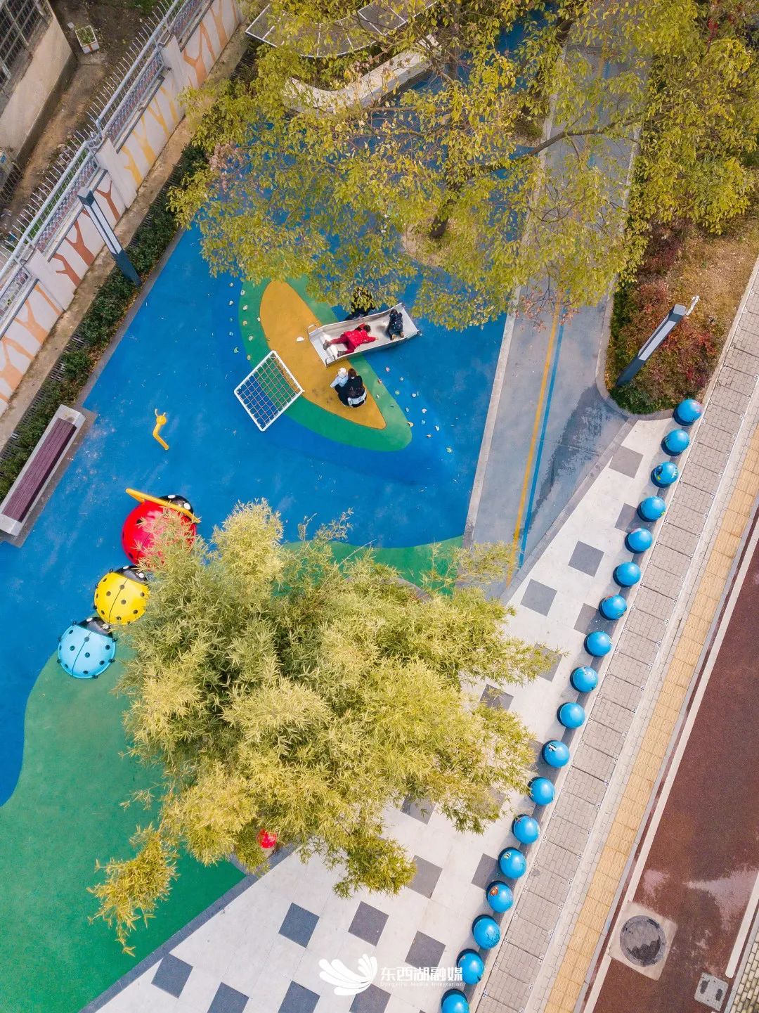 东西湖区园林绿化养护服务中心负责人韩琳介绍,改造升级的游园打破原有的封闭边界规划布局,植入多处功能场地,在靠近学校一侧设计“拾光广场”方便家长等待闲坐;中心位置结合现状高大香樟区域,在林下布置儿童活动场地“童梦乐园”;靠近公交站的一侧设计为开阔的“朴树广场”,供市民等车休憩;以一条彩色园路串联,路旁分布“花林秋千”、“折纸廊架”两处节点,尽添童趣。