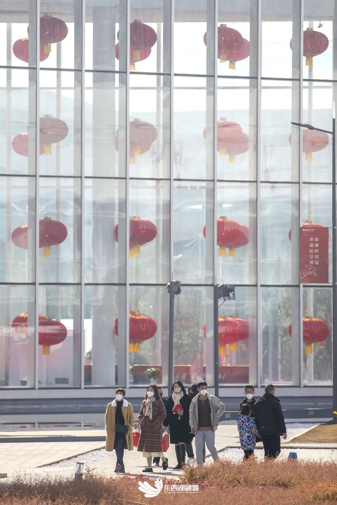 火红的灯笼、中国结、红爆竹装扮着潮年的艺术磁场,金红相称的宫庙门楼尽显宏伟大气,映入眼帘的是红彤彤的“新春新体验 幸福临空港”主题大字,由中国结与红灯笼搭就的“迎客通道”,喜迎四方游客前来。