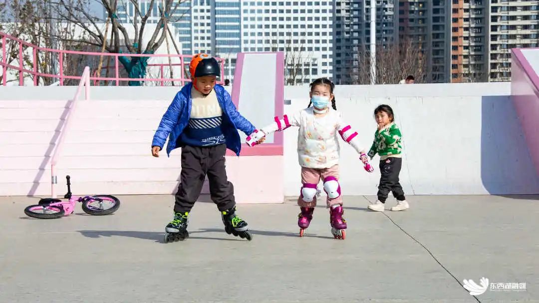 在樱花溪公园极限运动场地,滑板、轮滑爱好者和周边家庭纷至沓来。小朋友们在户外溜上一圈又一圈,元气满满。