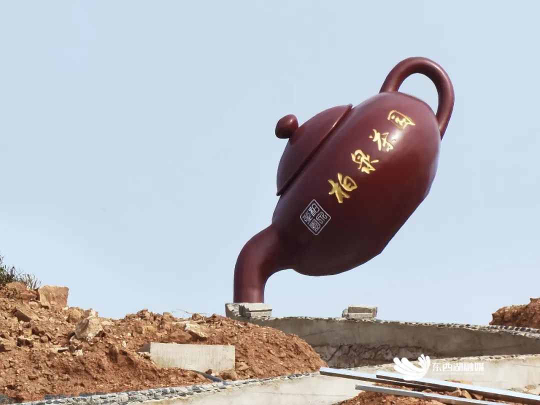 在村湾里的柏泉茶园,一座高2米的大茶壶矗立在茶园中央,好似悬空在空气中,颇有分量。