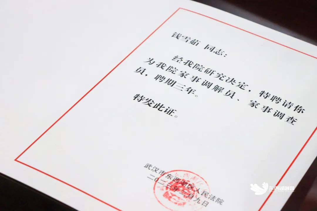 活动现场,15名来自街道社区妇联组织、巾帼志愿者团队、社会工作者组织“三支队伍”的专业人员,受聘为东西湖区首批家事调解员和家事调查员,任期为3年。