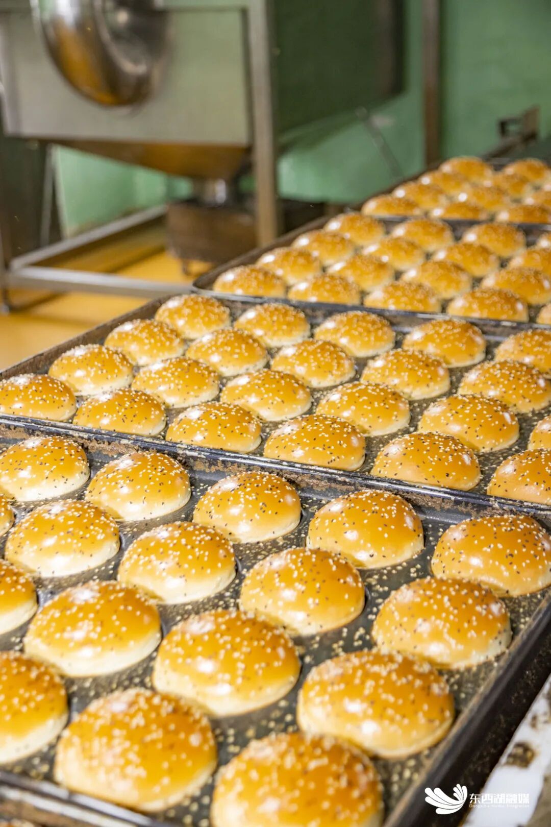 “撒一层水,再撒一层芝麻,之后就进入隧道炉进行烘烤,我们车间的这条隧道炉有27米长,2米宽,烤量大,火色均匀,从隧道炉出来,汉堡胚就烤好了,等待冷却后,在成品区包装。”叶朝晖说,生产工艺看似简单,但在标准化方面的探索,百宜食品一直在改良精进。