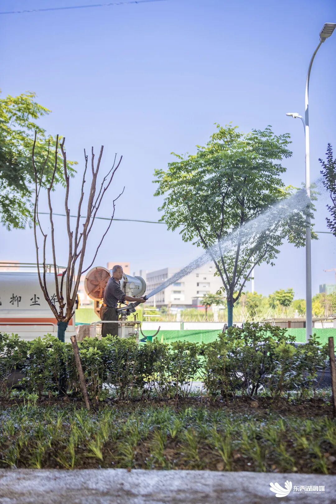 绿化工人浇灌新栽种苗木