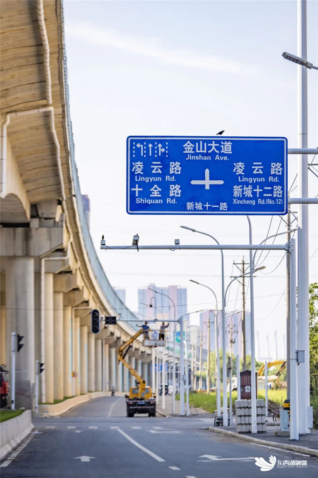 新城十一路,工人安装信号灯