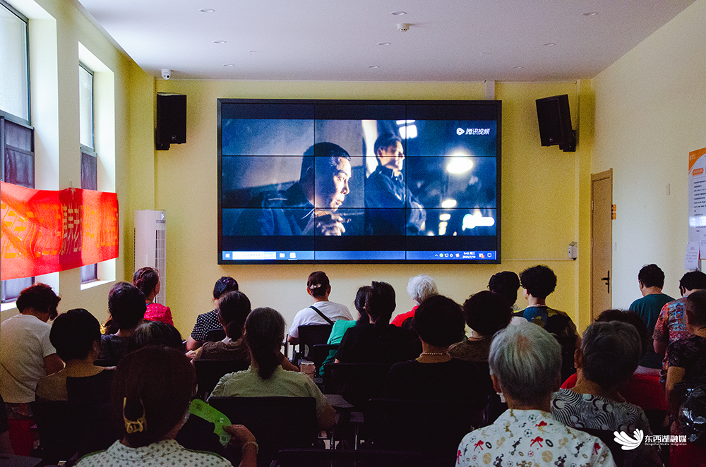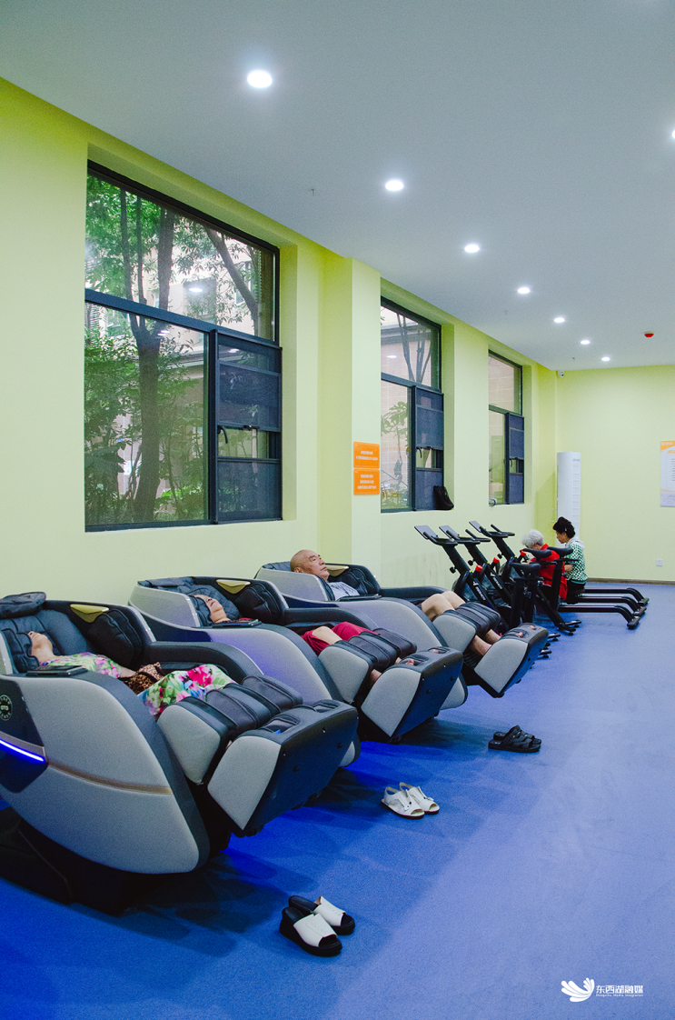 记者在纳凉点健身康复室看到,数名老人正在按摩椅和划船机上按摩或锻炼。观影室里,70岁的熊咏梅正和30多位居民观看电影《革命者》。这几天,她每天上午步行10分钟来到老年人活动中心纳凉,交到了不少新朋友。