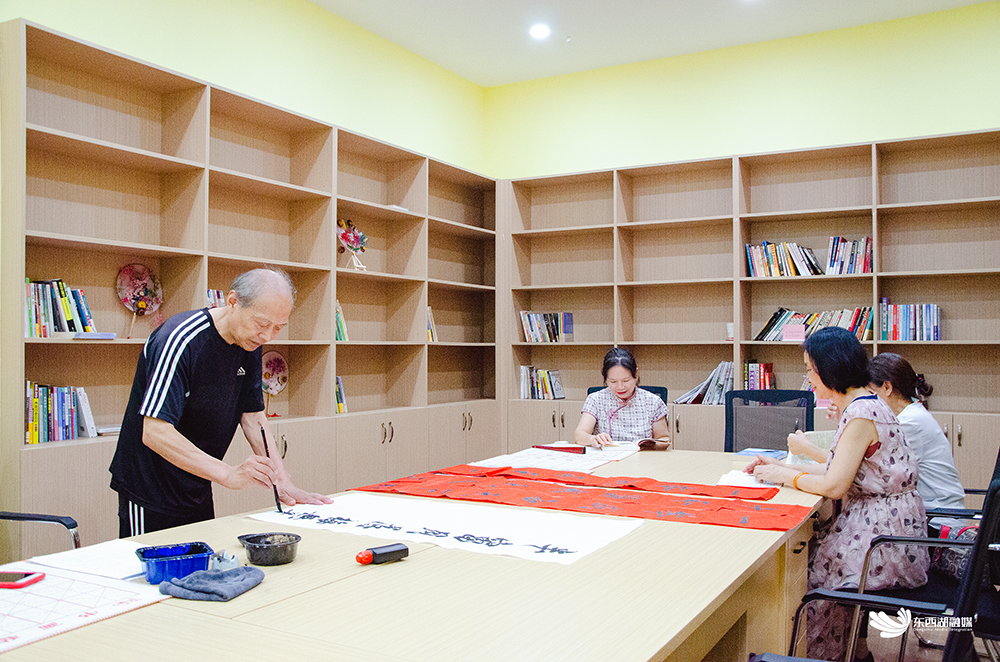 在图书阅览室,67岁的戴明炬正在练习书法。“这里还有净水机呢,就像自家一样温馨。”戴明炬前来“探班”的女儿看到眼前清爽的环境、周到的服务,连声点赞。