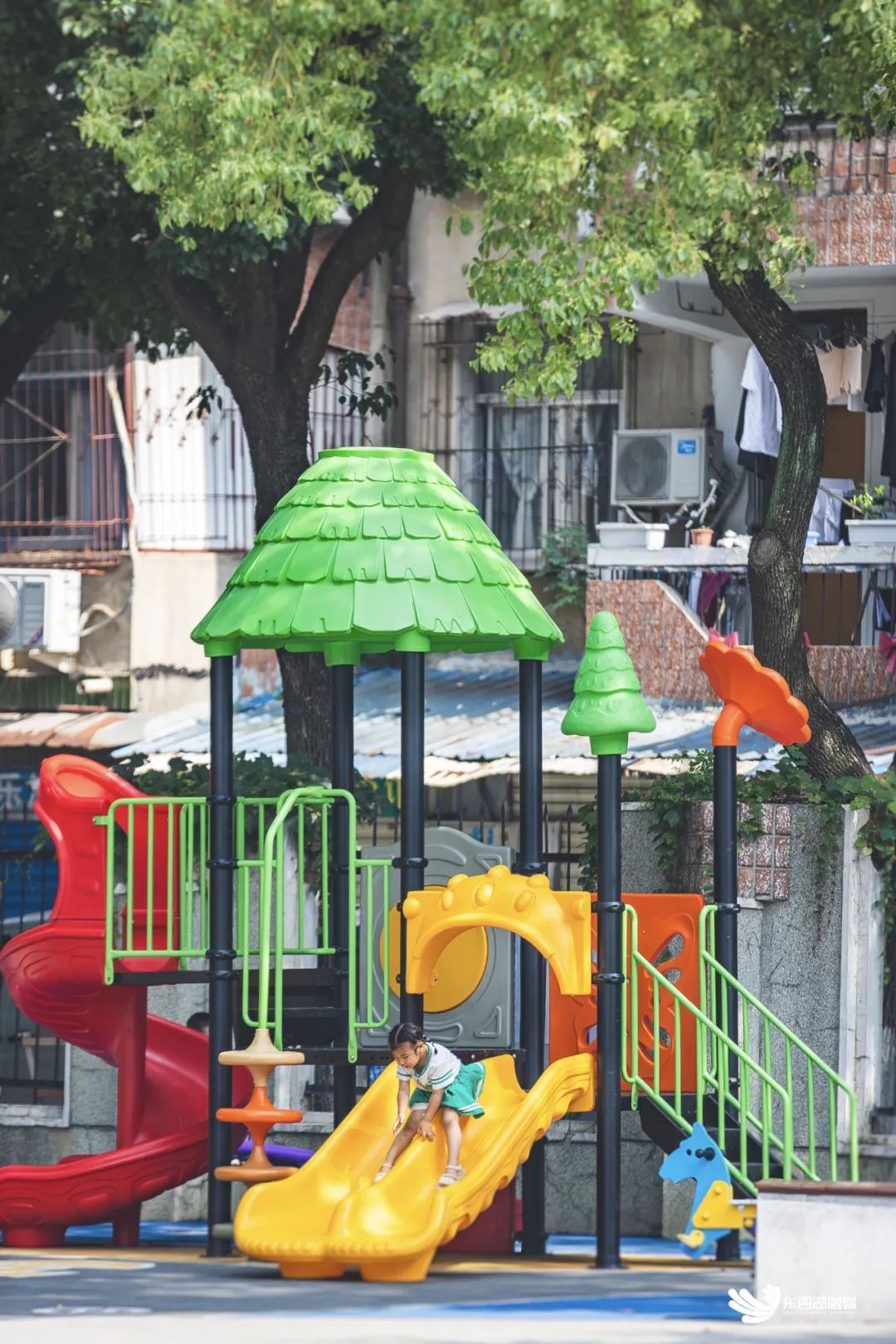 树木葱茏,环境宜人,在园内玩耍的孩子们,笑声爽朗悦耳。