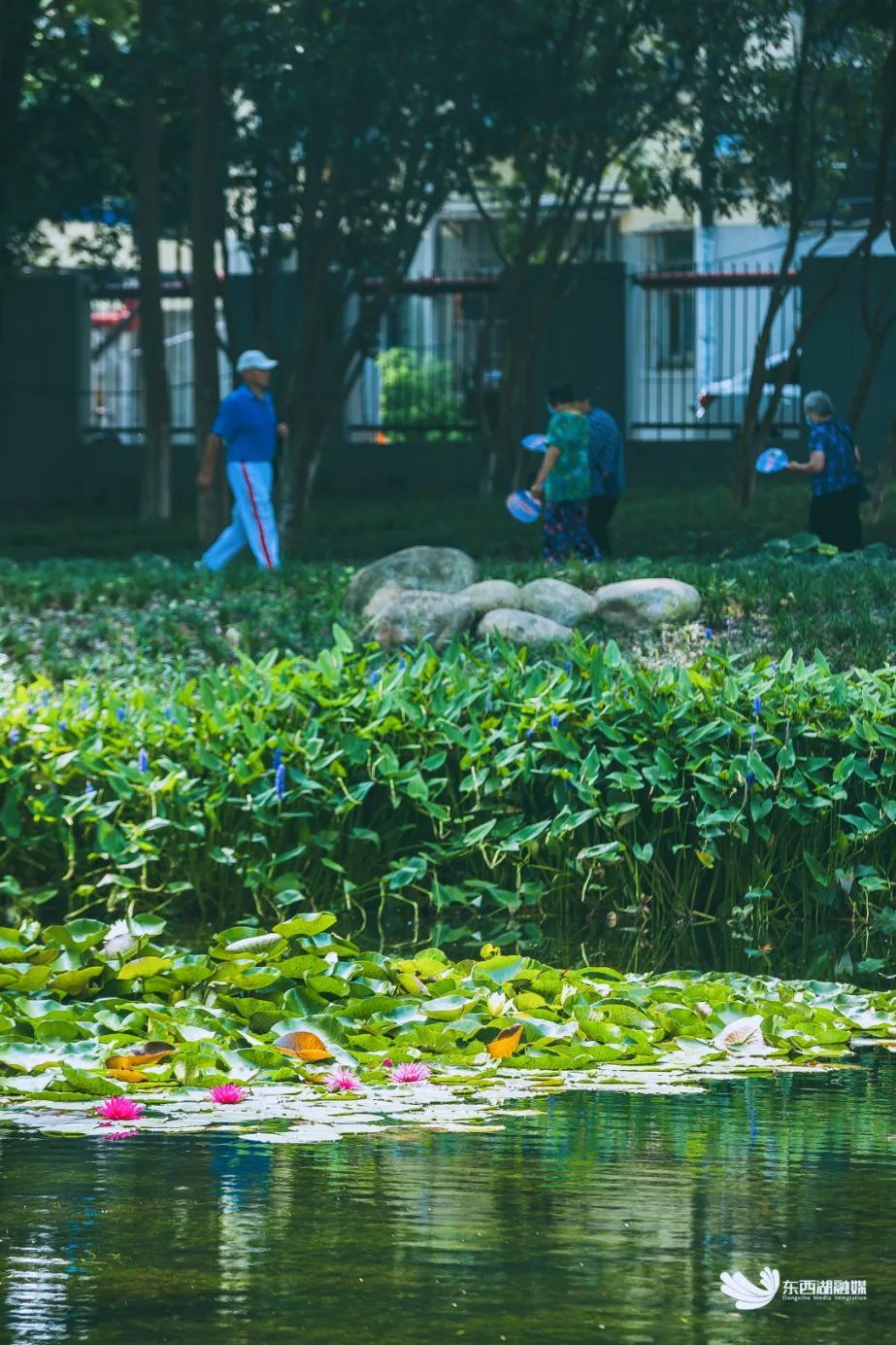 湖里的睡莲、菖蒲生机盎然,紫色花朵娇艳欲滴。