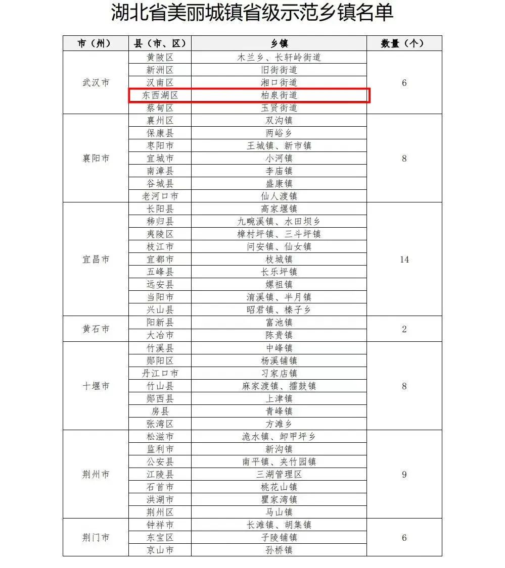 8月1日,省住建厅公布全省美丽城镇省级示范乡镇名单,100个乡镇上榜,东西湖区柏泉街榜上有名。