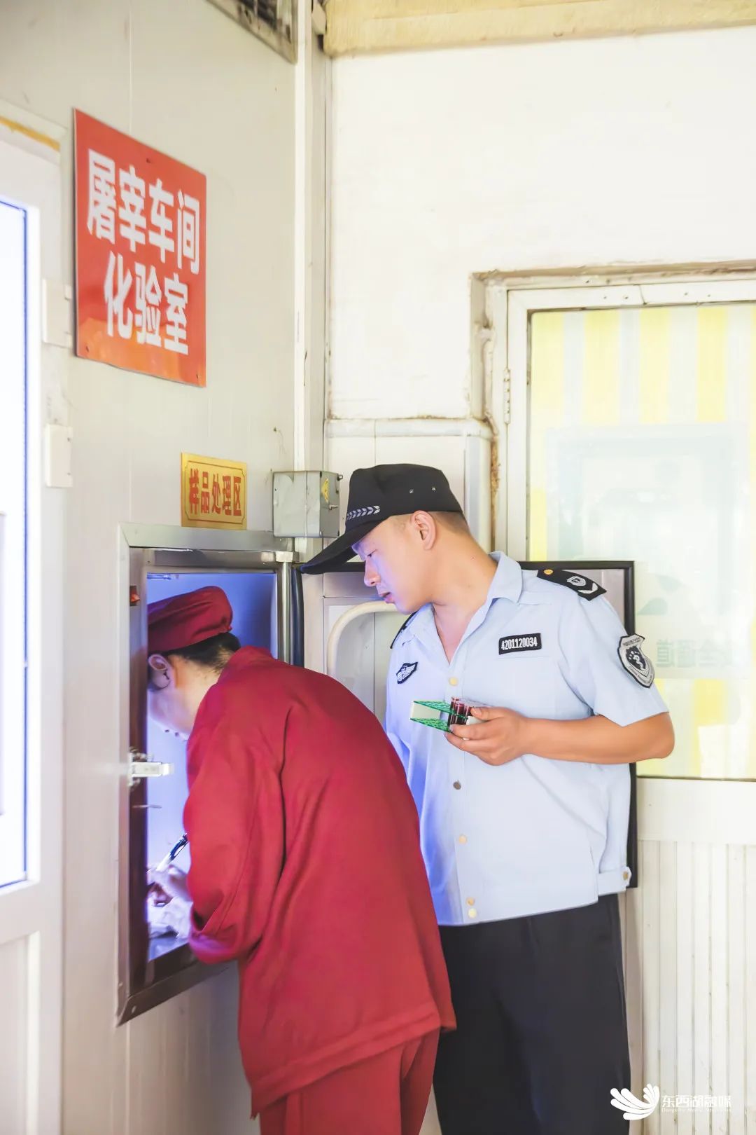 屠宰车间上午开始屠宰生猪,经前期检疫合格后的生猪在被宰杀时,依然要经历重重检疫关卡:区农业农村局驻厂检疫人员会对每头生猪进行头、蹄、体表、内脏、胴体等部位进行现场检疫,平均每头猪都要经过6个检疫岗位的检疫人员屠宰线上“16刀剖检”,一旦发现异常立即进行无害化处理。