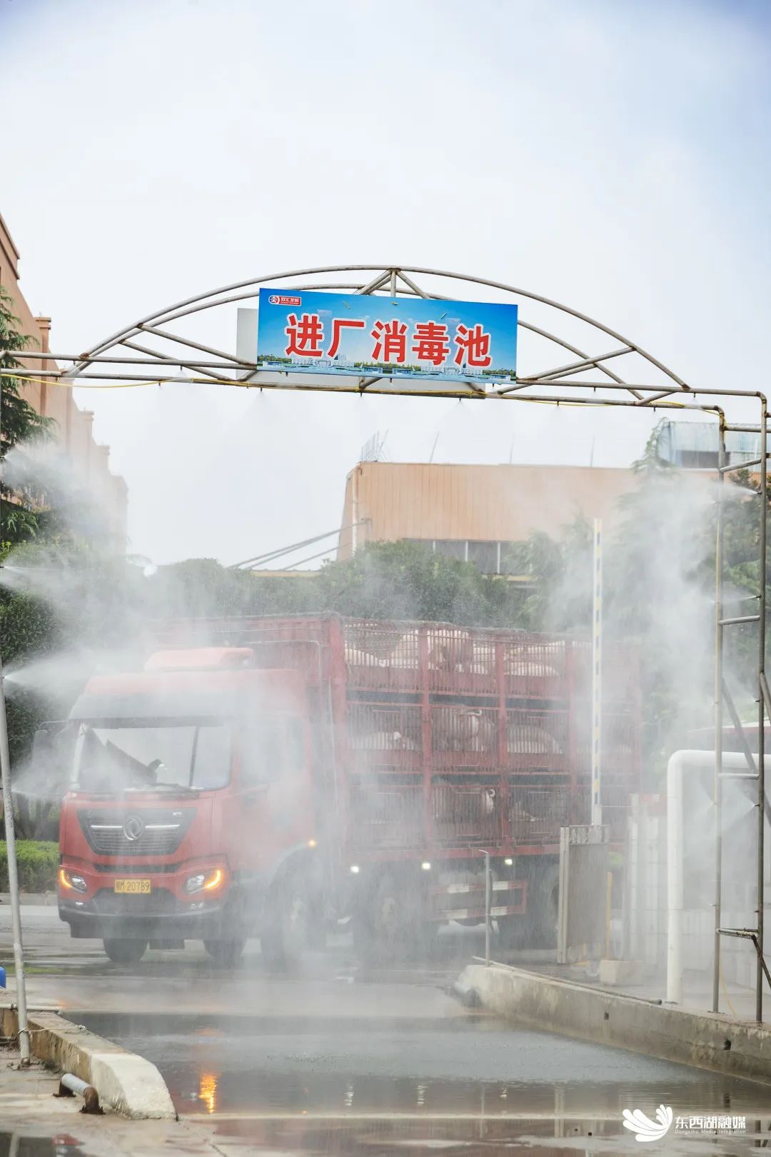 通过检查关口后,运输车辆将开往进厂消毒池进行消毒,随后进入待宰区进行卸货,并将生猪赶至待宰猪舍,为避免生猪在等待过程中因高温中暑,厂区还会为生猪进行喷水降温。