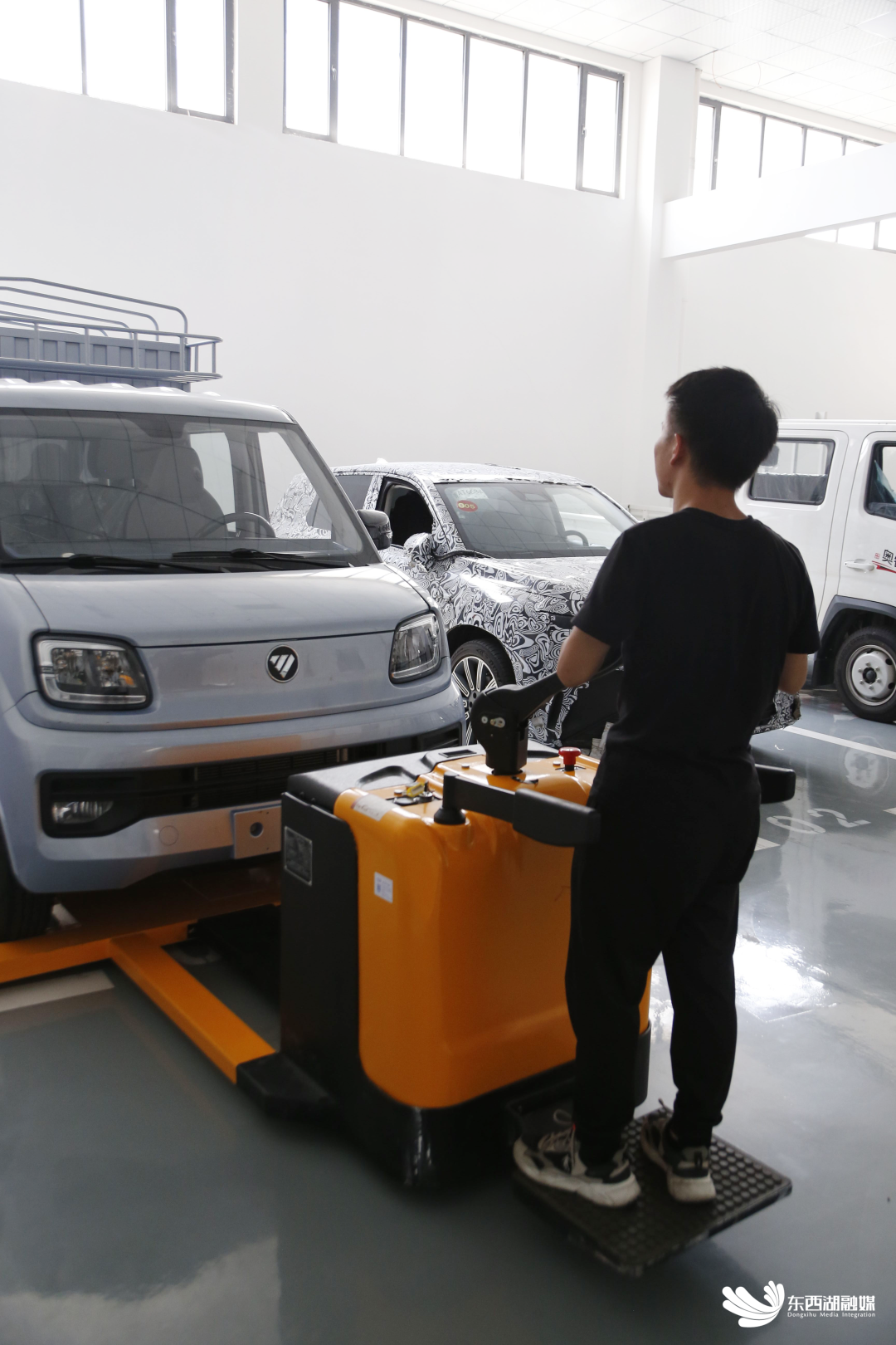 工作人员将车辆运往排放实验室