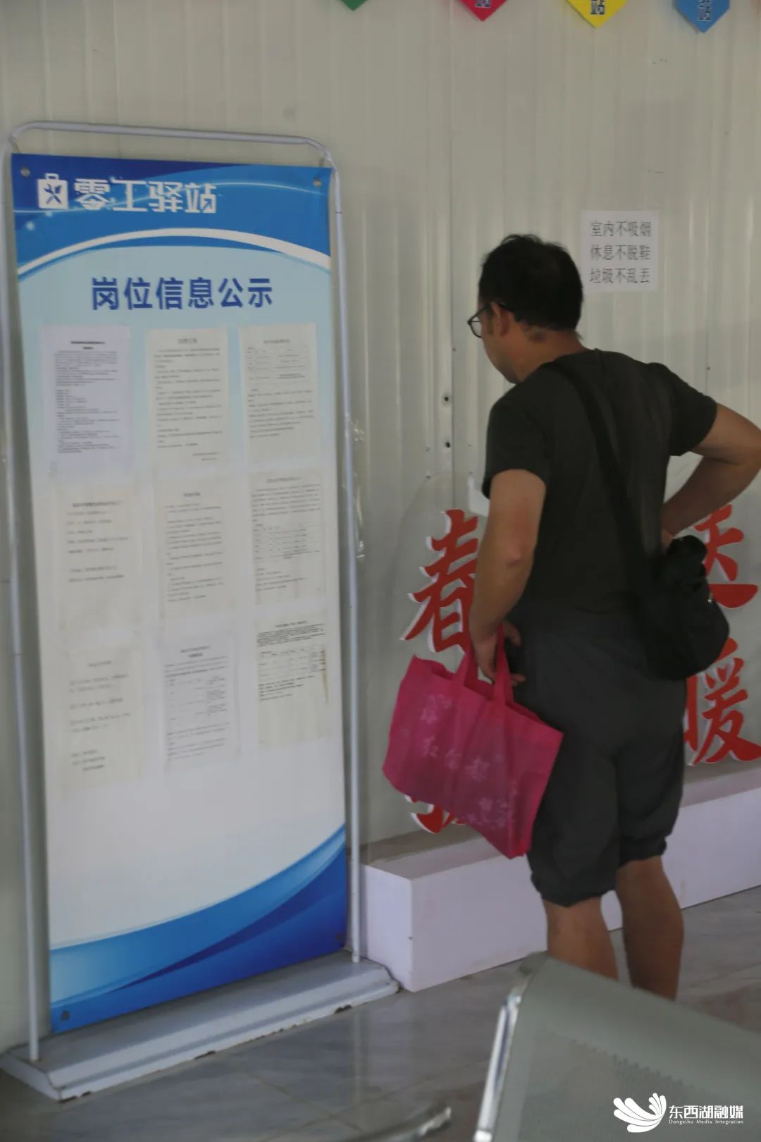 “周黑鸭招化冰员、包装工、杀菌工、选货员,5500元保底,多劳多得;晓毕物流公司190元一天……”信息板上,贴有数十家企业提供的最新招聘信息,纳凉的零工人员正在驻足观看。