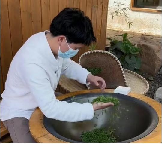 杀青结束后,需要放在阴凉茶让其慢慢回潮,一般回潮时间大约一到两个小时左右。回潮结束后,就要再次把茶叶放回锅中,用小火烩,用手翻炒,运用扣、推、抓、压、磨手法给茶叶塑形,直到把水分烘干,辉锅时茶叶要根据茶叶的老嫩灵活掌握力度和时间。