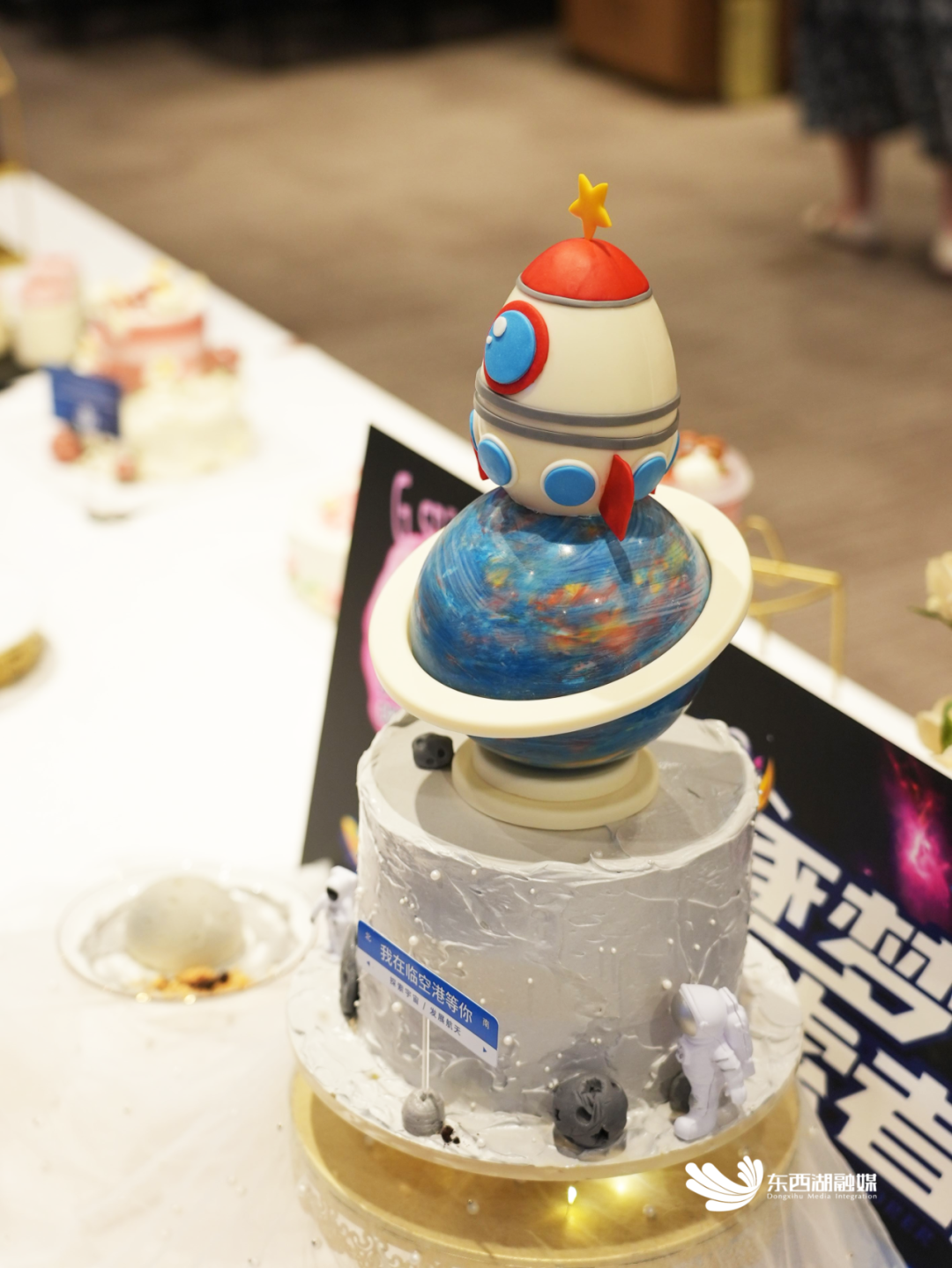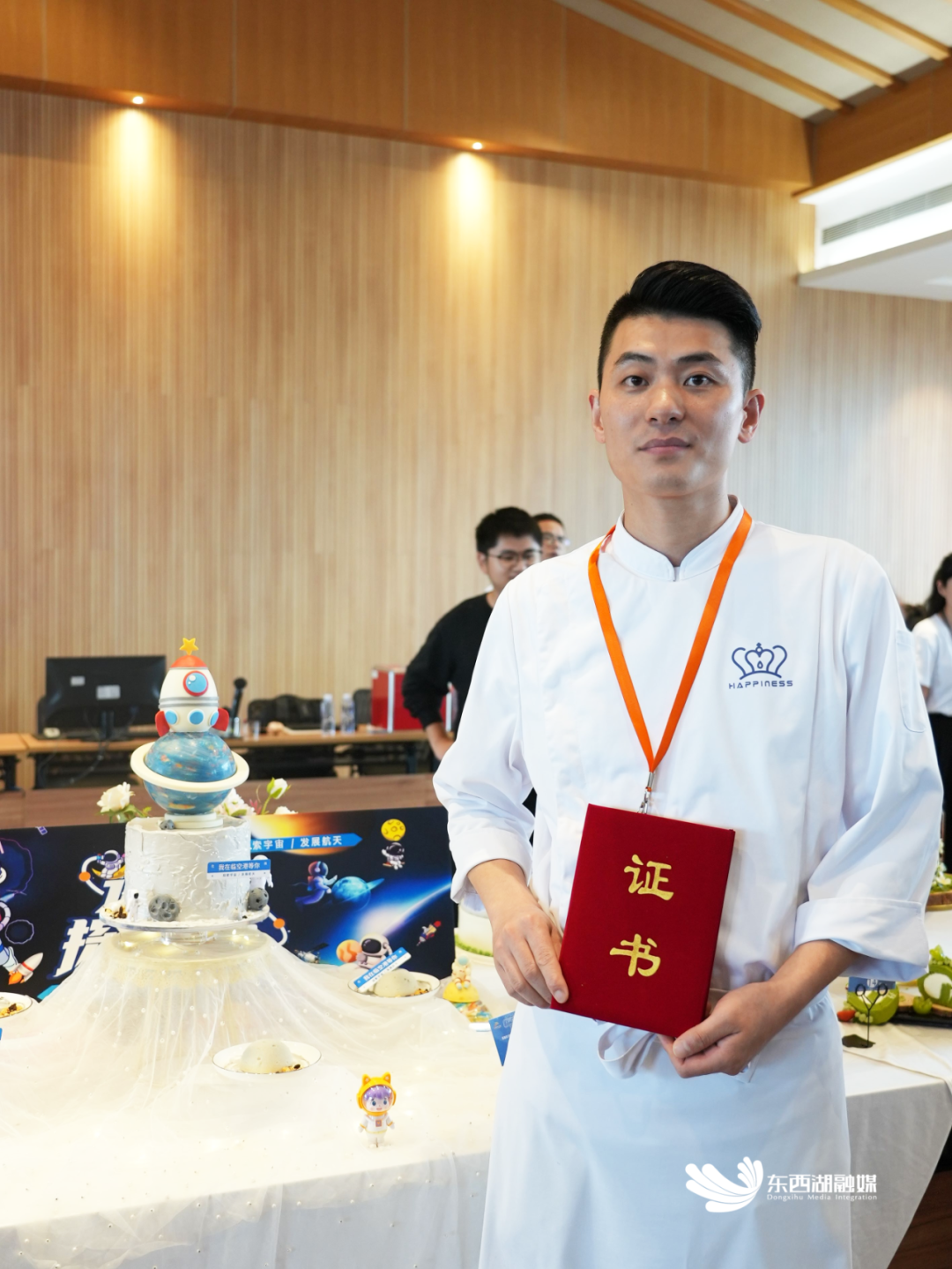 经过理论和实操比赛,张军亮获得西点制作竞赛一等奖。作为“新东西湖人”,他的作品名叫“我在临空港等你”——宇航员、外太空,在临空港乘“机”而上,腾飞远行。作品创意跟中秋节也有关联:团圆的节日到了,不管离家有多远都要回来,我在临空港等你……