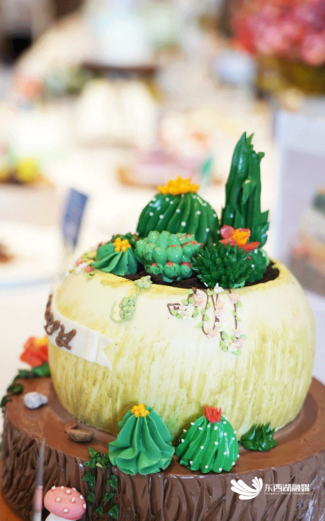 “我平时在门店工作,是抱着学习心态来参加比赛的。”选手马莲学过西点制作,后来重新出发,入职玫隆皇冠,成为一名西点师。带着年轻人的创新劲头,她此次带着作品“绿水青山就是金山银山”参赛。