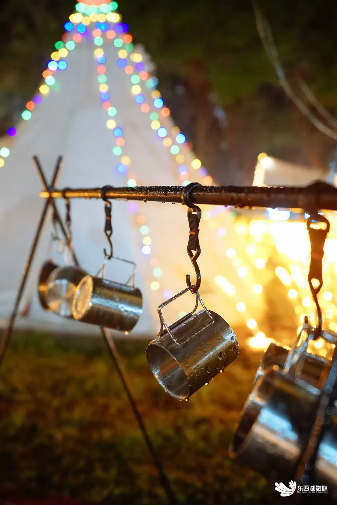 露营营地被夜色笼罩,帐篷上的灯光渐渐亮起,雨中的夜景愈发迷人。用卡式炉煮点餐食,与三五好友举杯围坐,畅聊人生,十分惬意。