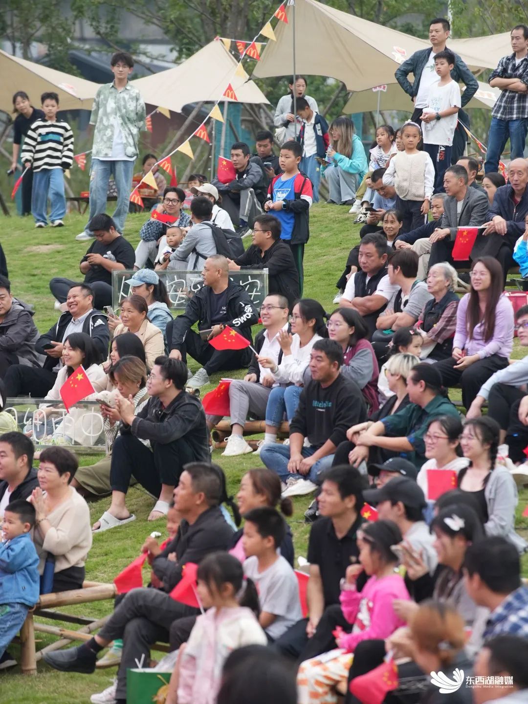 歌手轮番献唱,现场座无虚席。众多游客或在座椅、或在帐篷,一边享受美食,一边享受音乐。年轻人、老年人都手持荧光棒,挥舞着国旗。还有小朋友坐在长辈的肩膀上,兴奋地手舞足蹈。