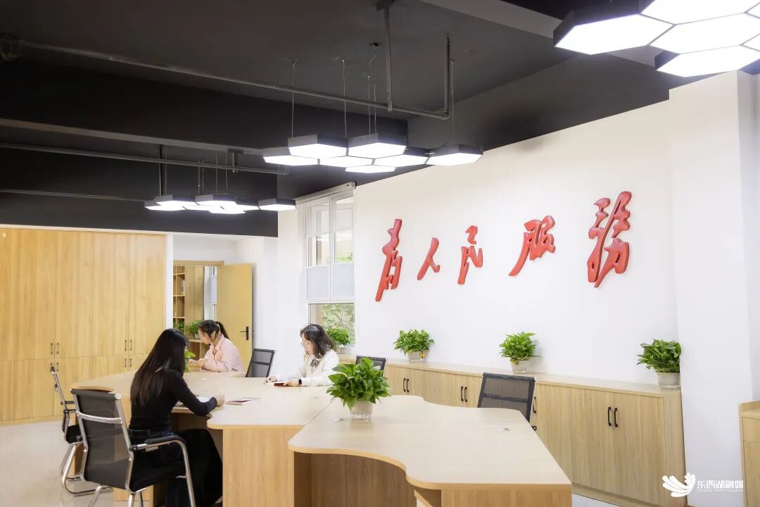 走进中心,整个大厅空间开敞、色彩温馨、设计亲民,还取消了传统党群服务中心“大前台”的设计,窗口服务只设有4个接待工位。