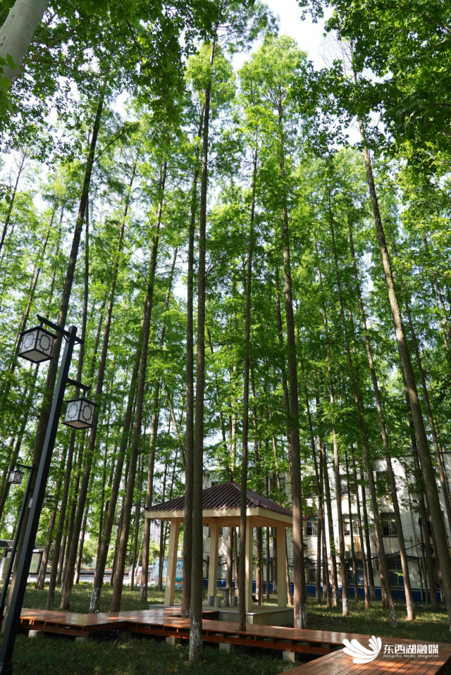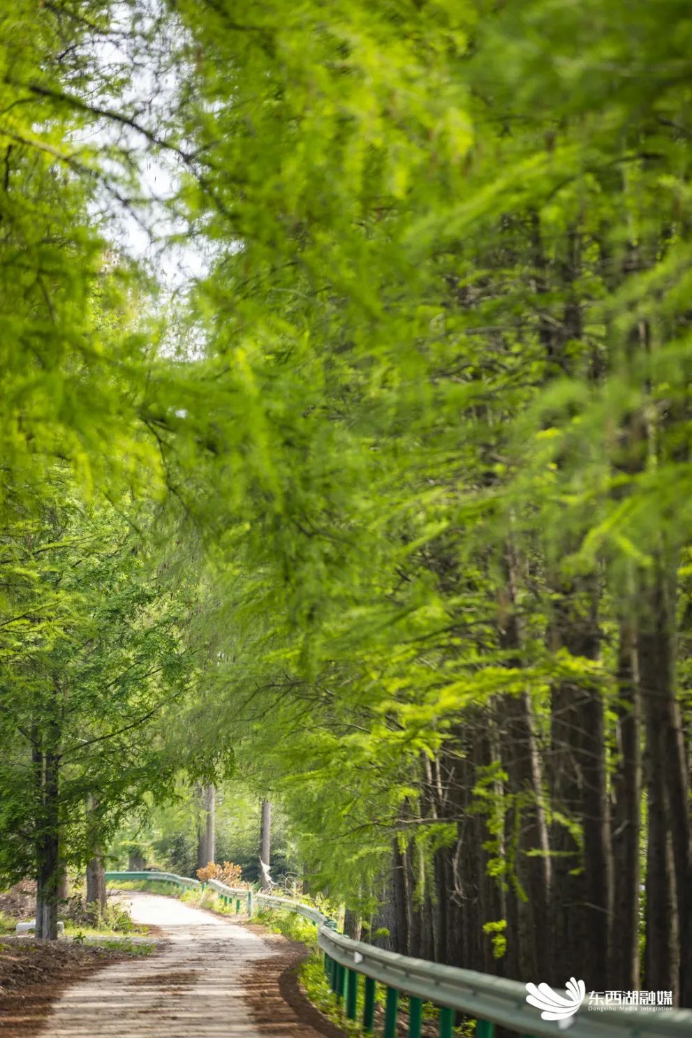 月牙湖社区两旁道路均水泥硬化并安装了护栏,行走在道路上,全是水杉绿荫,置身其中犹如秘境探幽。