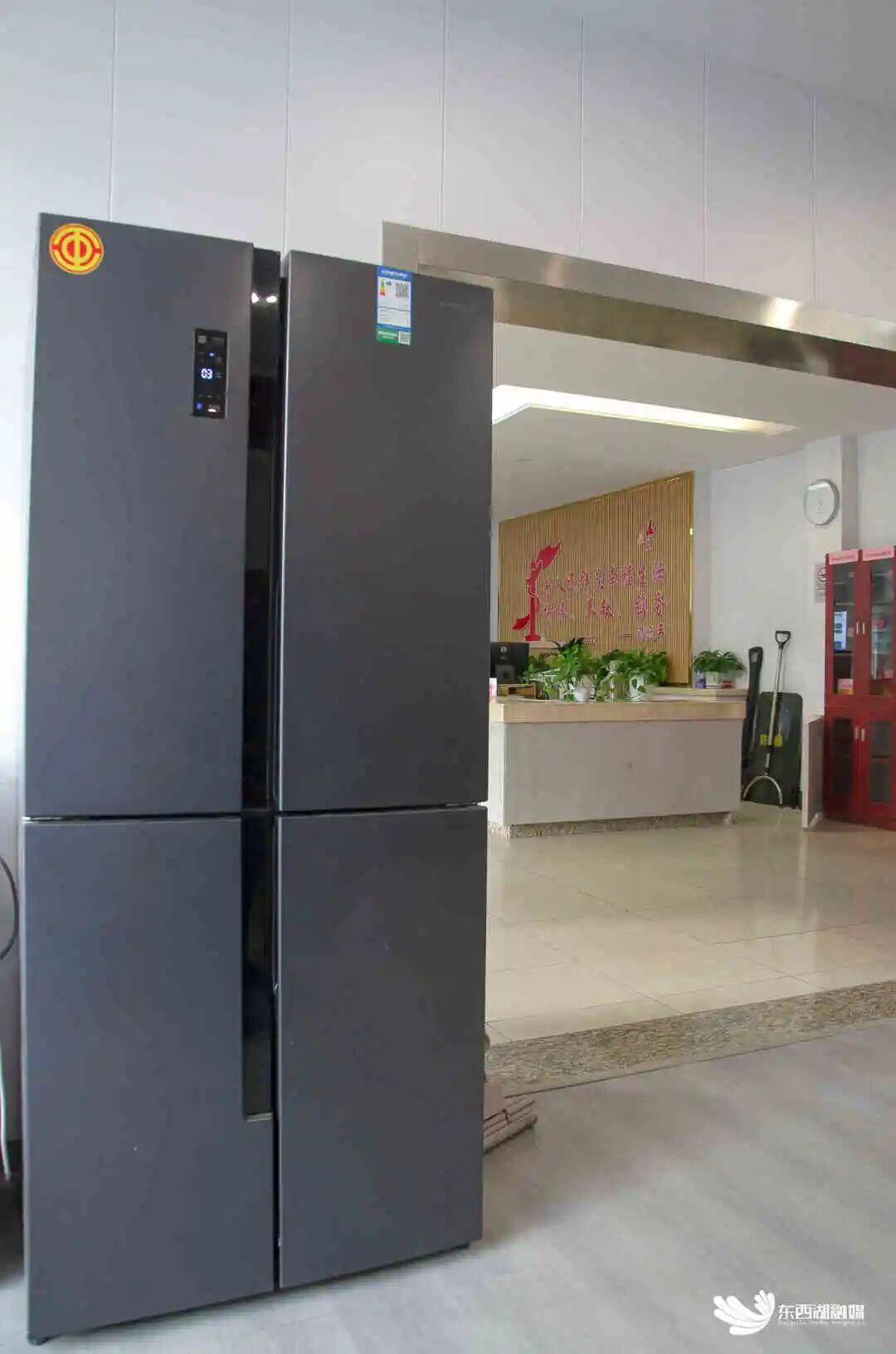 室内空间位于距离十米开外的东兴里社区党员群众服务中心。除了饮水机、桌椅、空调、医药箱、书籍报刊栏等设施设备外,这里还配备有冰箱、微波炉、针线盒、雨伞等日常生活用品。