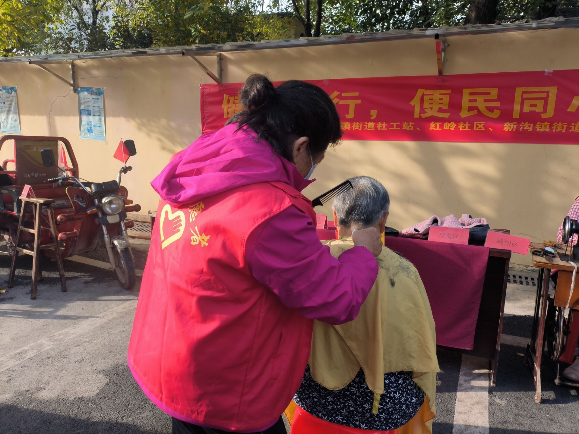 在红岭社区以“健康同行,便民同心”为主题的志愿服务活动现场,志愿者正在为辖区居民提供理发、缝纫、义诊、修鞋等丰富优质的便民服务。志愿者还为参加活动的居民准备了互动游戏环节和精美礼品,宣传志愿服务精神。