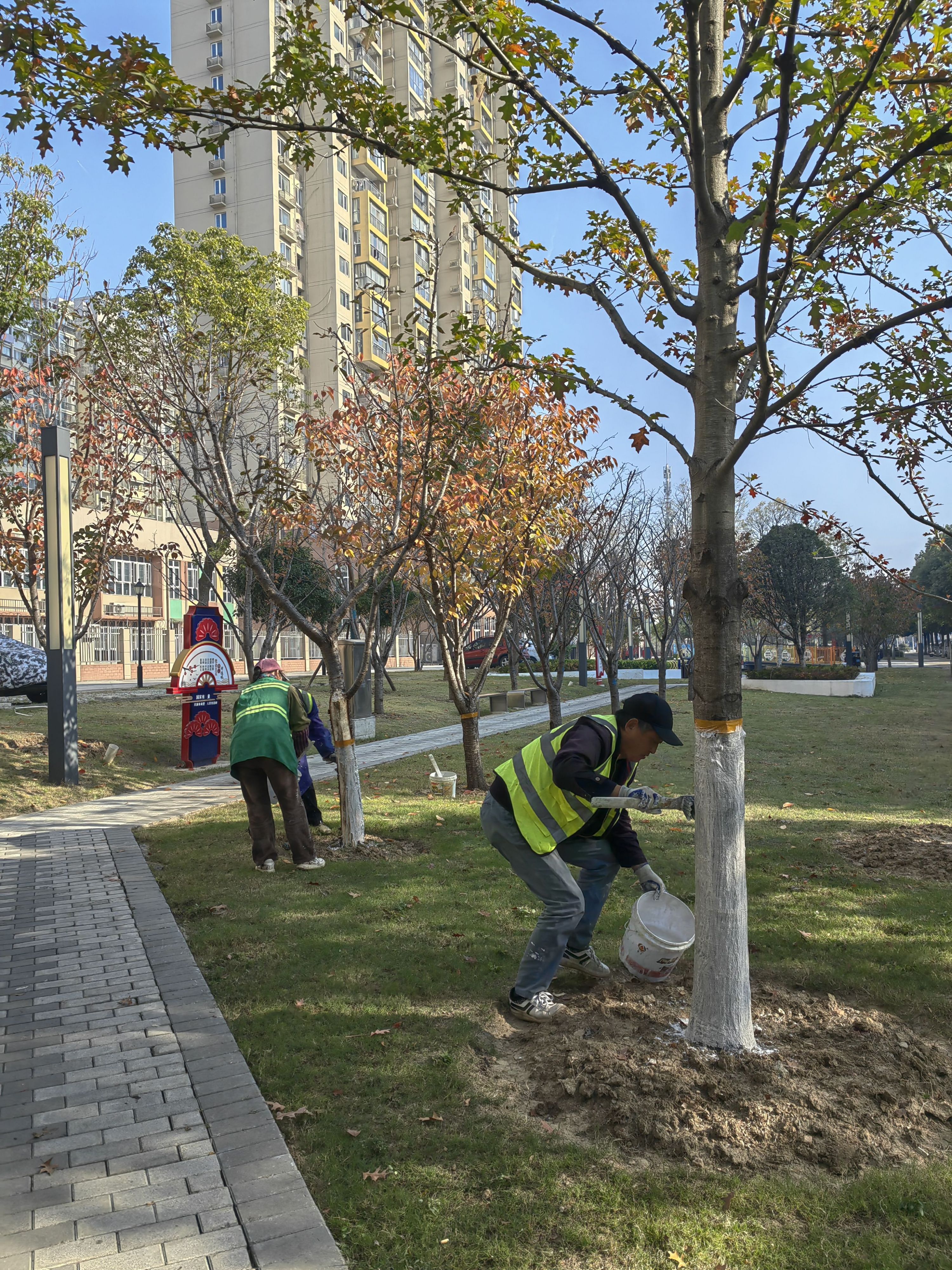 树干刷白,是最传统、最常见的方式,通过搭配一定药剂,起到防虫作用,还能改变色差,降低昼夜温差避免冻害。记者近日在将军路街主次干道看到,园林工人正对辖区树身进行有序刷白。结合园林植物的生理特性和我区绿地布局结构、功能特点,全区自11月启动行道树刷白工作以来,已完成金山大道、临空港大道、金银潭大道等路段约27300株行道树的刷白,占全部工作量的73.4%。