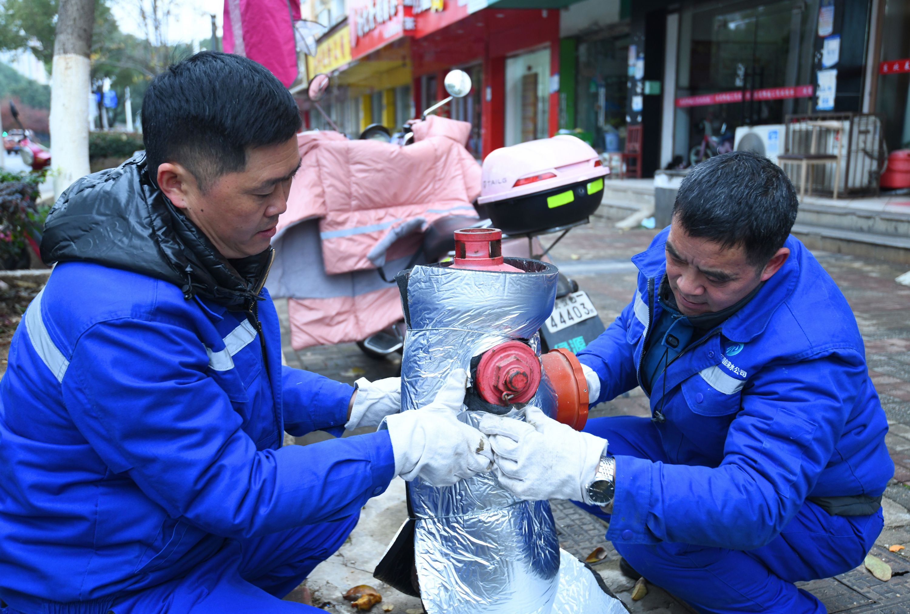 12月11日,气温骤降,东西湖区自来水公司提前对消防栓、户外裸露管道等易冻设施“体检”,为供水设施穿上“小棉袄”。