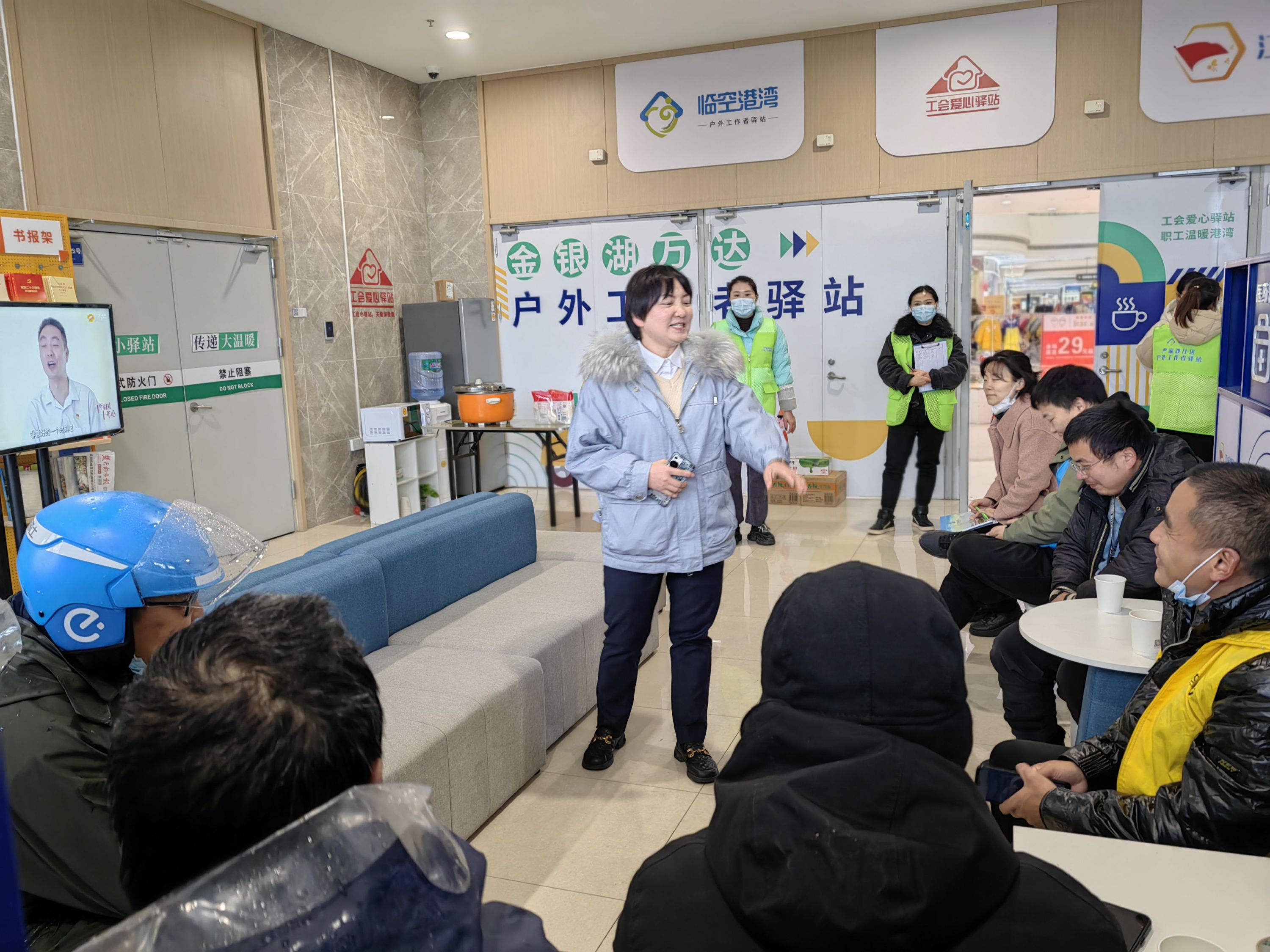 据了解,为做好新就业群体服务工作,金银湖街严家渡社区围绕新业态新就业群体需求导向,在金银湖万达商圈打造暖新驿站,设置临时休息、饮水充电、积分兑换等功能区域,提供夏天避暑、冬天取暖等多项服务。“我们忙起来就是一整天在外面,有了这个驿站,就在商圈里,比回家还方便,能喝杯热水、热个饭,很暖心。”外卖小哥黄师傅坐在金银湖万达户外工作者驿站感慨道。
