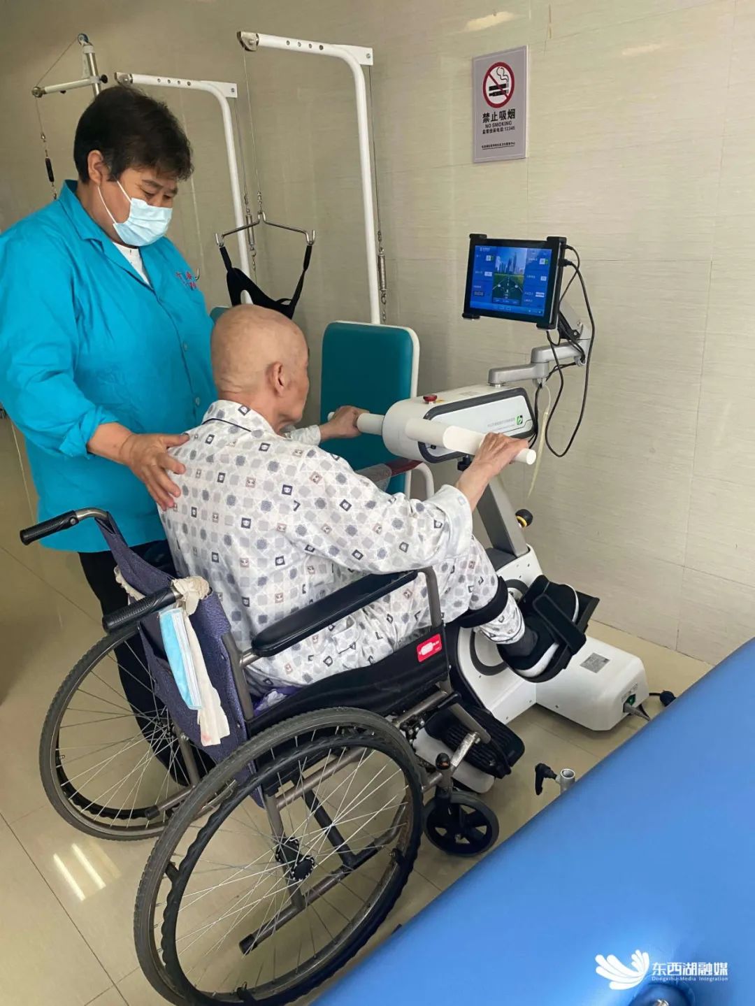 护士长熊菲观察到这一状态,就在每天上午查房后专门陪爹爹聊天。每天下午,康复治疗师按时为老人做肢体康复训练、按摩等专业康复,日常洗漱收拾全都交给护工阿姨。
